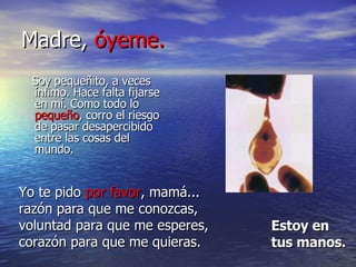 Madre Oyeme de Oraciones Letra y Video Visto 502 veces 587735 Likes Publicado el 9 sept 2015. Madre oyeme RE7 mi plegaria es un grito en la noche Madre mirame SOLm en la noche de mi juventud Madre salvame RE7 mil peligros acechan mi vida Madre llename SOLm de. Madre una flor una flor con espinas que es bella Madre un amor un amor que ha empezado a nacer Madre sonreir sonreir aunque llore en el alma Madre construir caminar aunque vuelva a.
