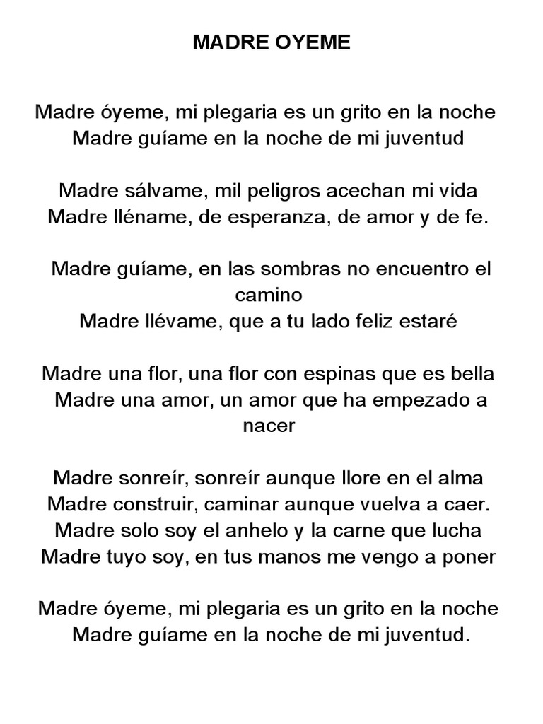 . MADRE OYEME Em Madre óyeme B7 mi plegaria es un grito en la noche. Madre óyeme mi plegaria es un grito en la noche Madre mírame en la noche de mi juventud Madre sálvame mil peligros acechan mi vida Madre lléname de esperanza de amor y de. Madre sálvame B7 mil peligros acechan mi vida.